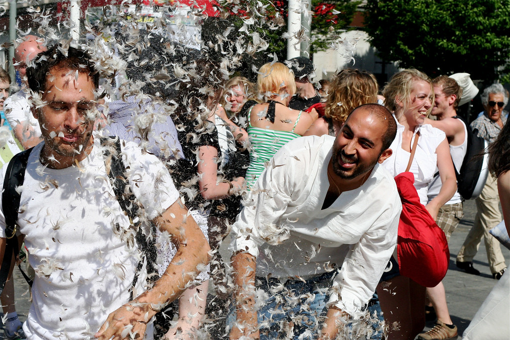 I lördags var det den internationella kuddkrigsdagen. Fjädrar fyllde luften i flera länder.