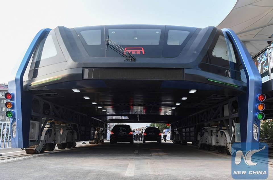 Nu kan framtidens buss vara här. Bussen är utvecklad i Kina. Den sträcker sig över hela vägen men tar nästan ingen plats.