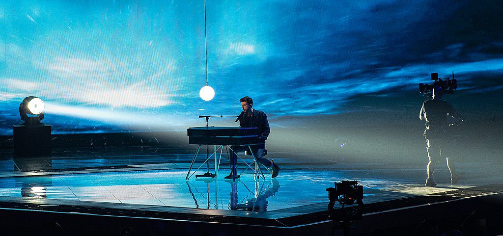 Bild från finalen i Eurovision. På scenen syns en man som sitter ensam vid ett piano. Det är mystiskt ljus på scenen.