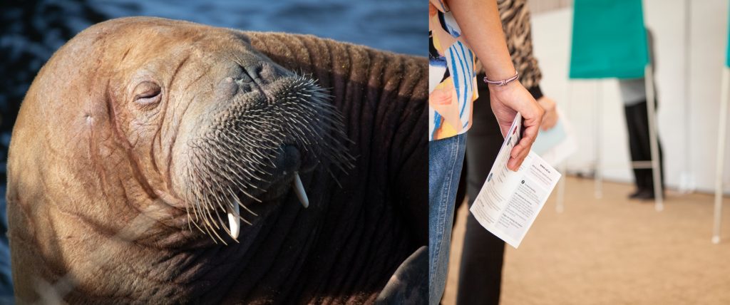 I veckan har nyheterna bland annat handlat om valrossen Freya och valet 2022. Foto: Shutterstock och Valmyndigheten.
