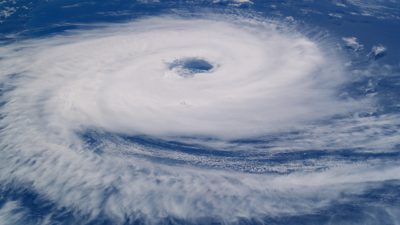 En orkan ovanifrån. Det är ett stort vitt, runt moln som ser ut att snurra. Under syns vatten.